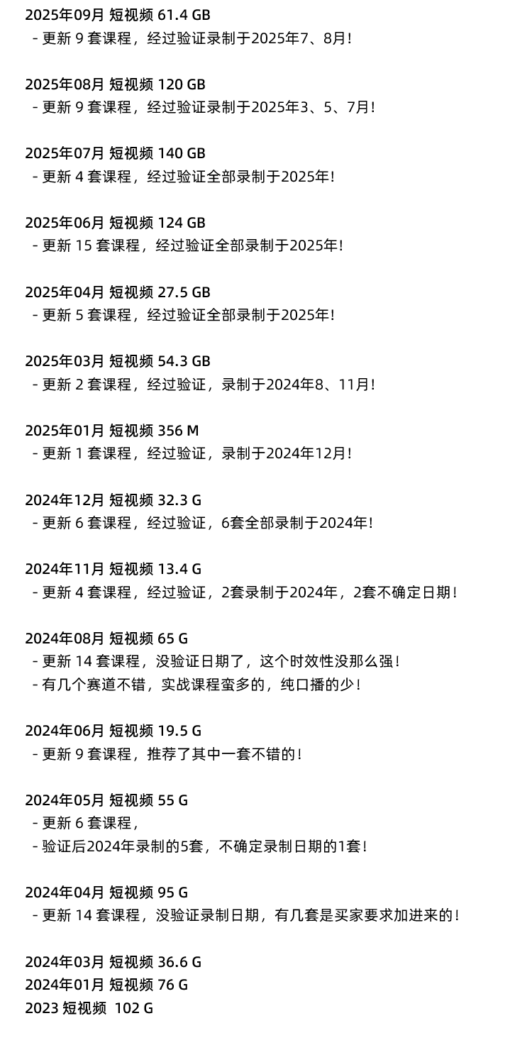 # 2025年10月 短视频 2.34 GB 点击查看详细更新记录 # 2025年09月 短视频 61.4 GB 点击查看详细更新记录 # 2025年08月 短视频 120 GB 点击查看详细更新记录 # 2025年07月 短视频 140 GB 点击查看详细更新记录 # 2025年06月 短视频 125 GB 点击查看详细更新记录 # 2025年04月 短视频 27.5 GB 点击查看详细更新记录 # 2025年03月 短视频 54.3 GB 点击查看详细更新记录 # 2025年01月 短视频 365 M 点击查看详细更新记录 # 2024年12月 短视频 32.3 G 点击查看详细更新记录 隐藏内容此处内容需要权限查看普通5金币永久会员免费推荐 购买本内容 收藏 海报 链接