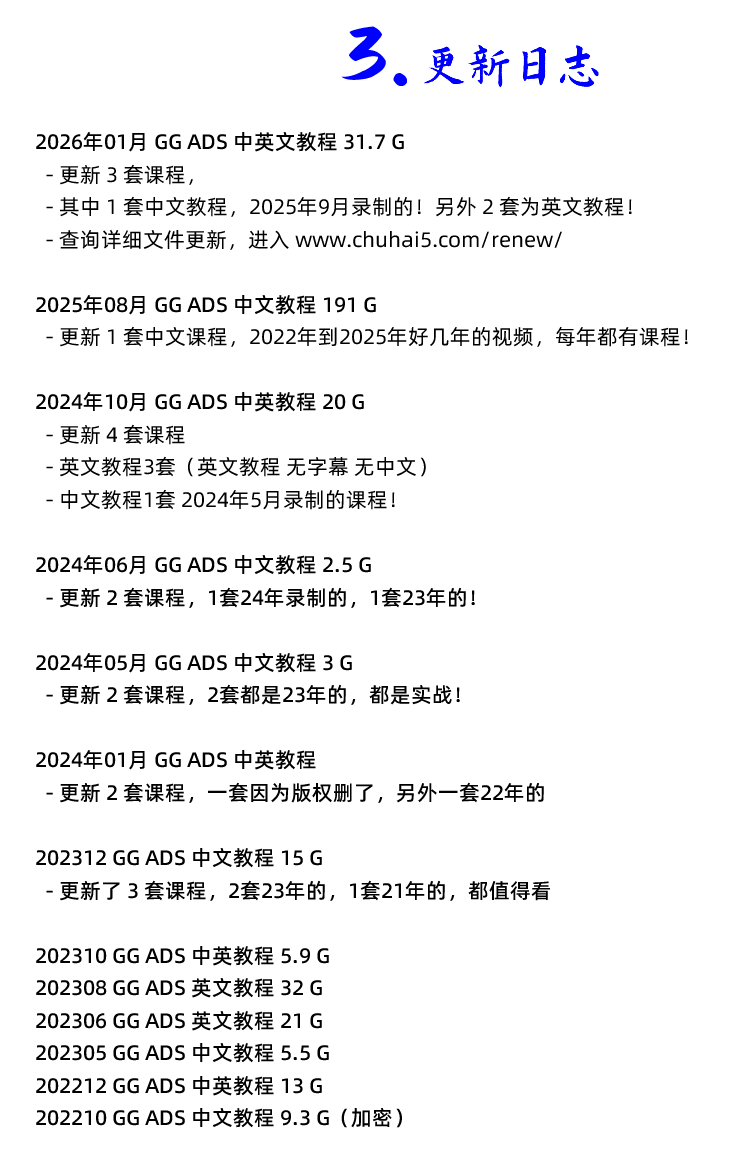 2026年开始 GOOGLE ADS 新课 请自行去更新日志页面查询该课程每次对应的文件更新: 查询地址:https://www.chuhai5.com/renew/ # 2025年08月 GOOGLE ADS 192 G 点击查看详细更新记录 隐藏内容此处内容需要权限查看普通59.8金币永久会员免费推荐 购买本内容 收藏 海报 链接